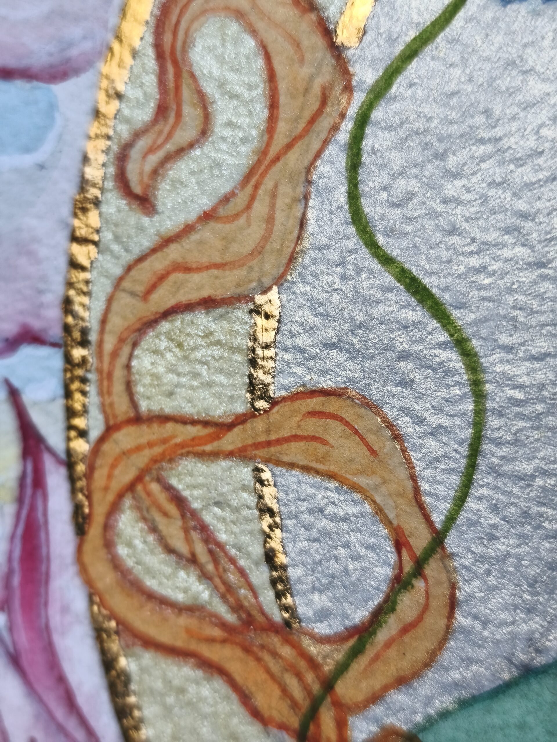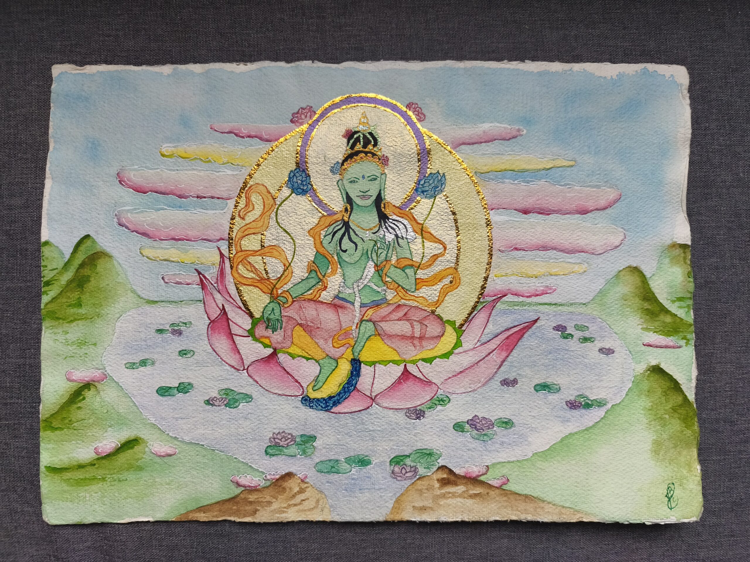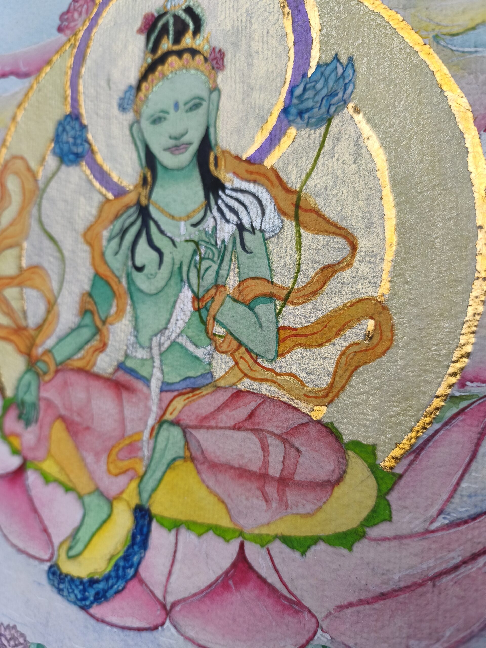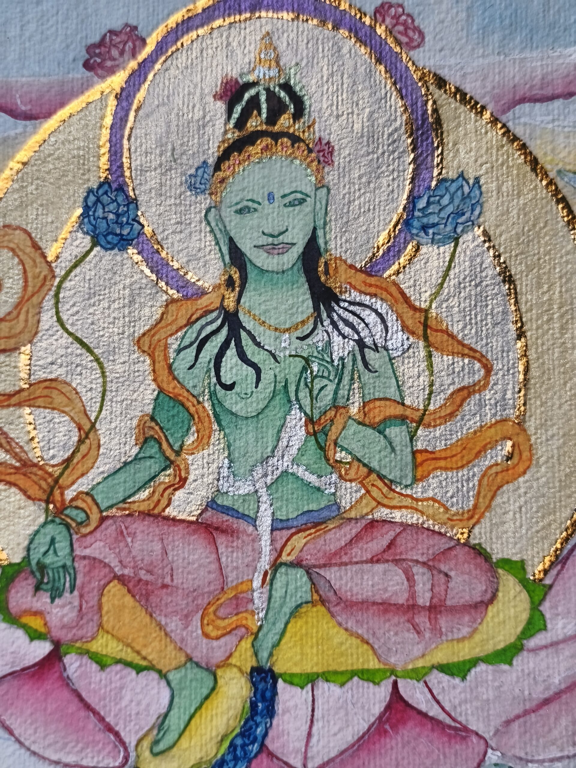 Tara Verte, dans sa posture traditionnelle, entièrement peinte à l’aquarelle avec des effets scintillants. Déesse de la compassion, beaucoup de douceur et de compréhension accompagnent son rayonnement dans cette représentation.